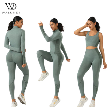 Conjunto de yoga Venta caliente 3 piezas Conjunto de yoga sin costuras con chaqueta con cremallera Leggings de cintura alta Sujetador deportivo Conjuntos de entrenamiento para mujeres